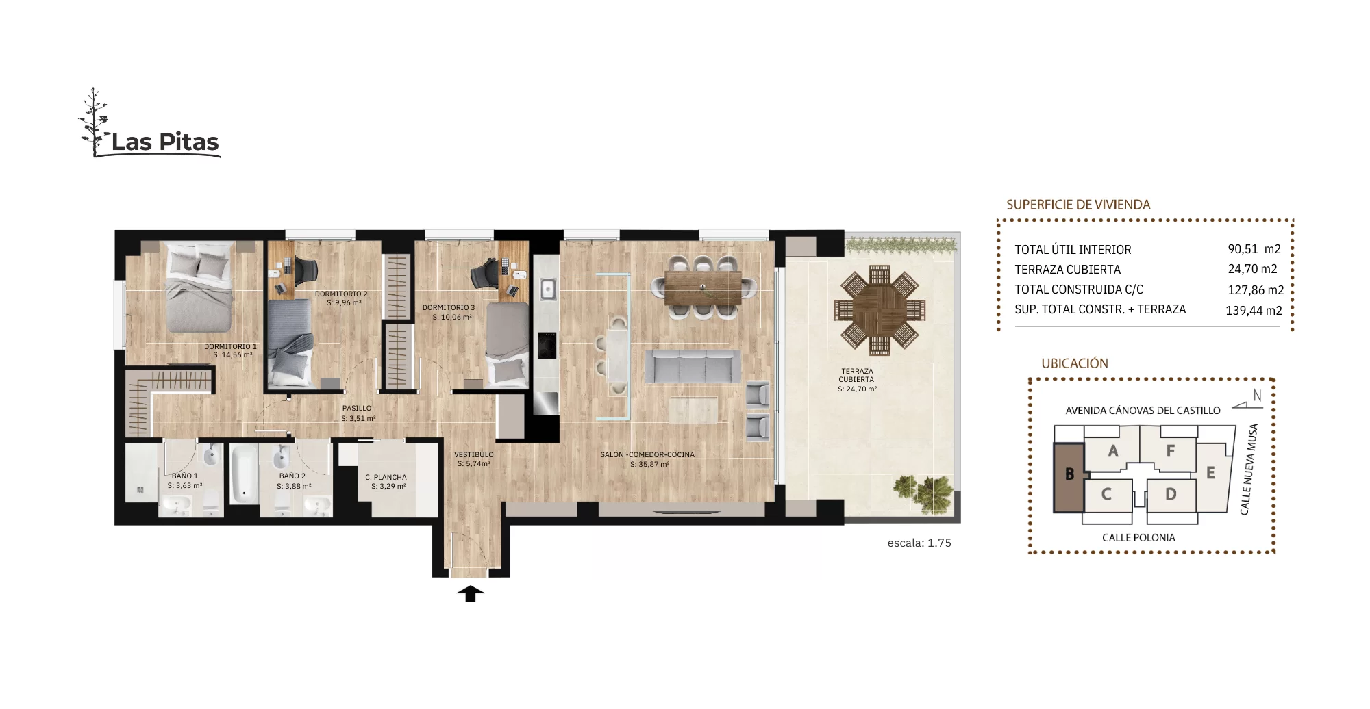 B | 3 | Noreste | 90,51m² | 24,70m² | 127,86m² | 139,44m² | – | Vendida |