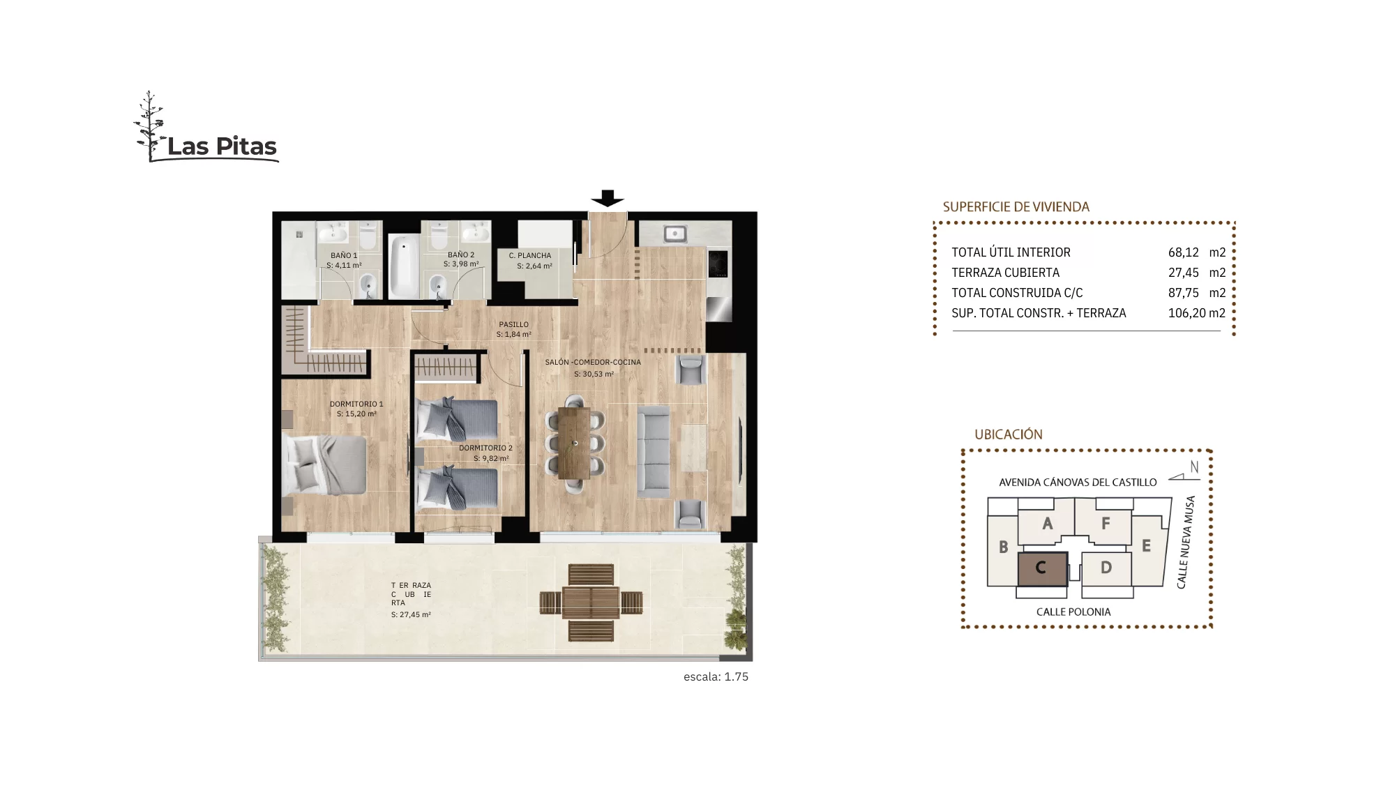 C | 3 | Suroeste | 68,12m² | 27,45m² | 87,75m² | 106,20m² | – | Vendida |