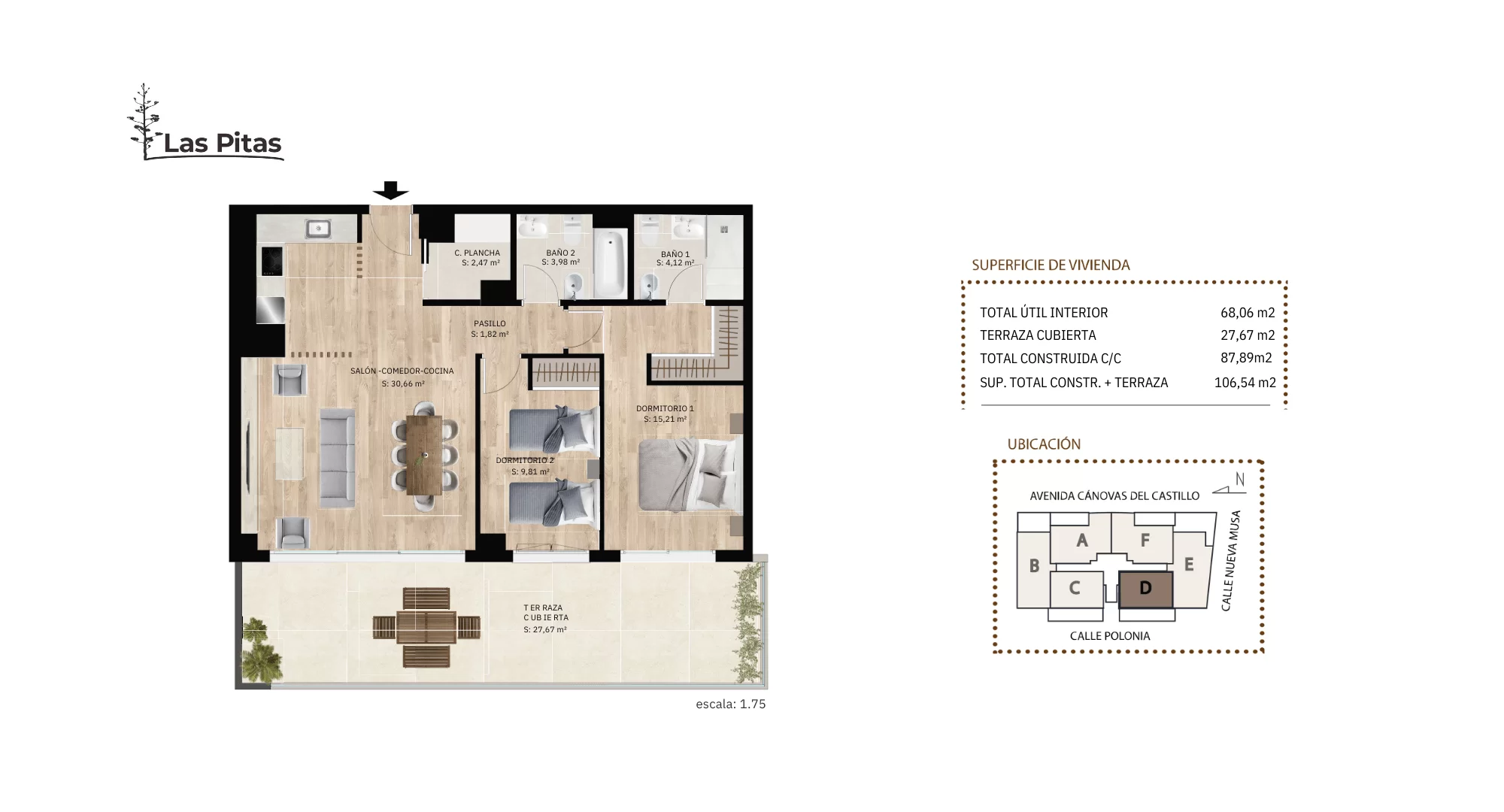 D | 3 | Sureste | 68,06m² | 27,67m² | 87,89m² | 106,54m² | – | Vendida |