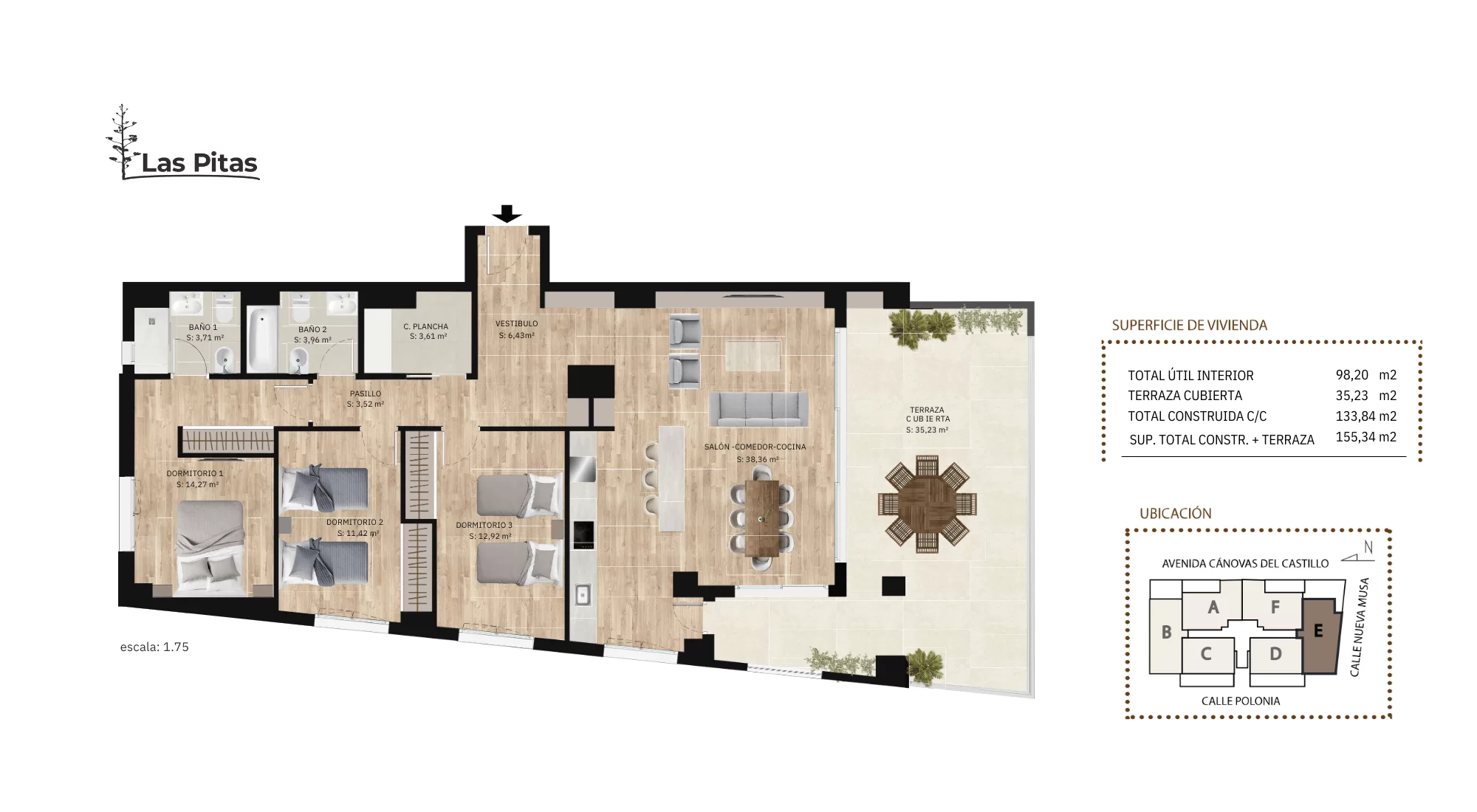E | 3 | Sureste | 98,20m² | 35,23m² | 133,84m² | 155,84m² | – | Vendida |